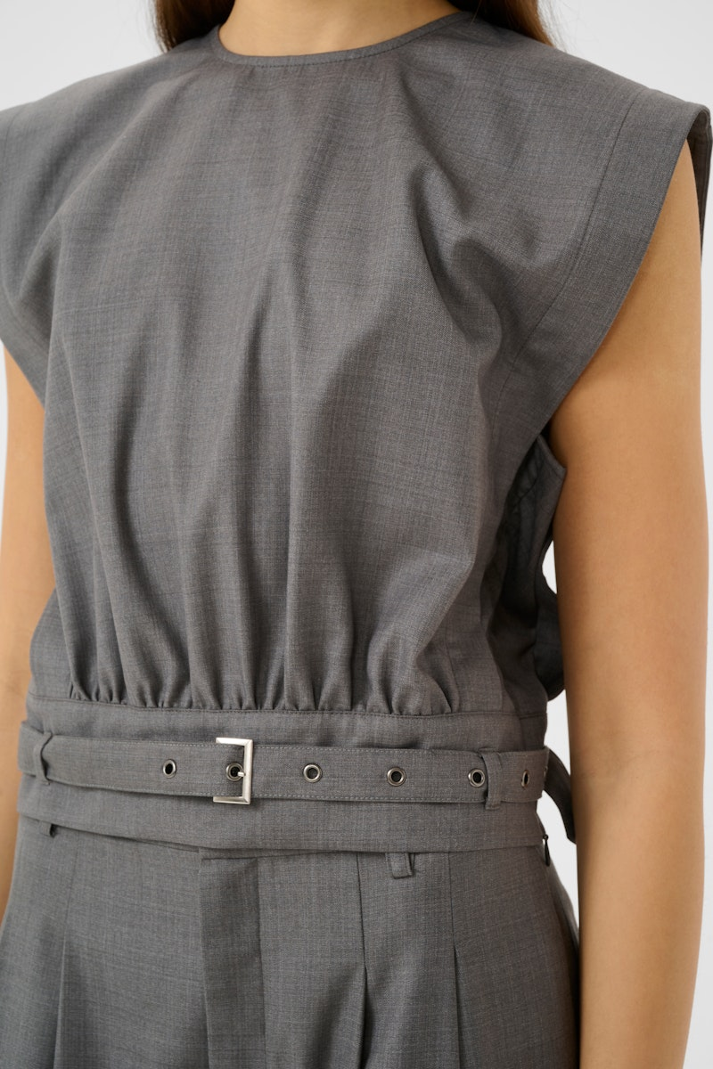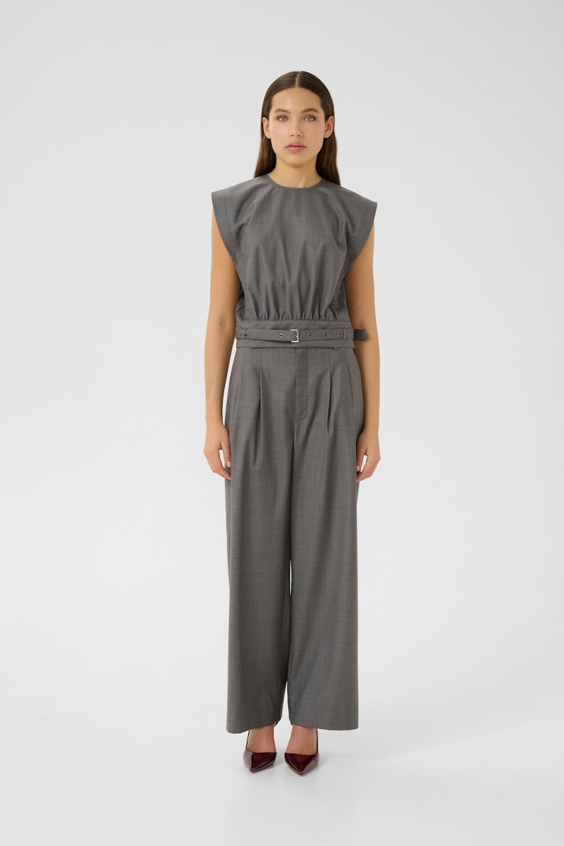 Top fra Gestuz med rund hals og brede skuldre. Designet har en justerbar talje med bælte, der giver form og struktur.