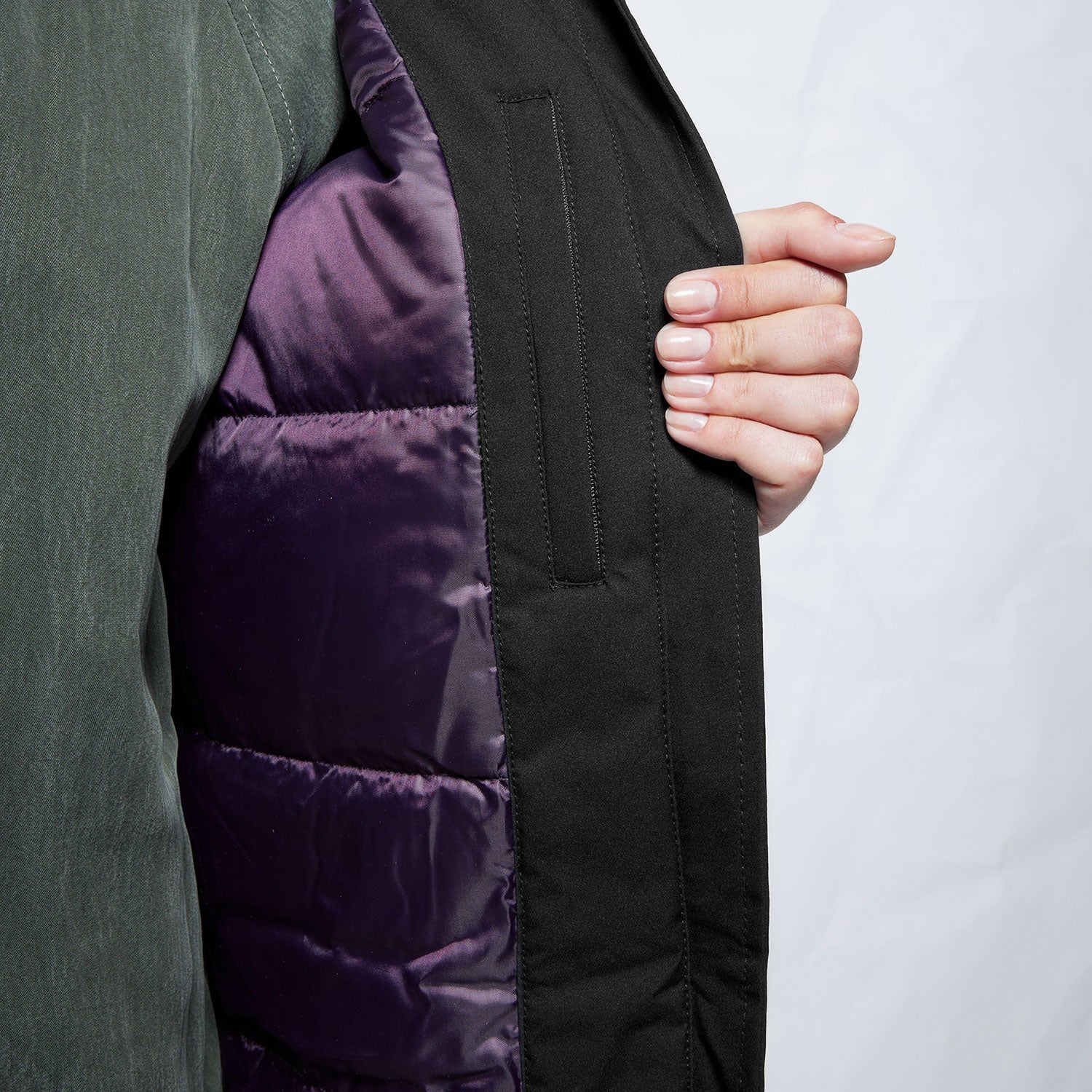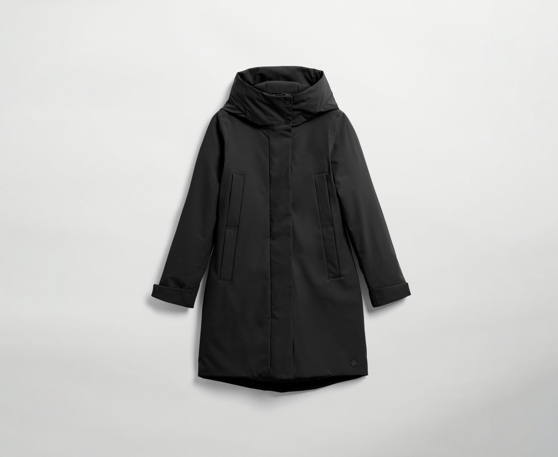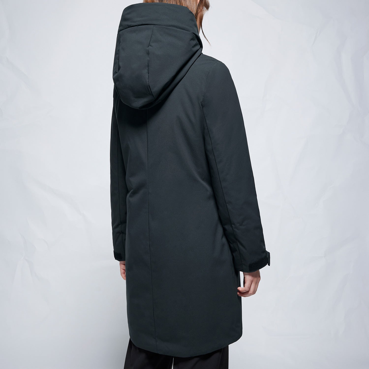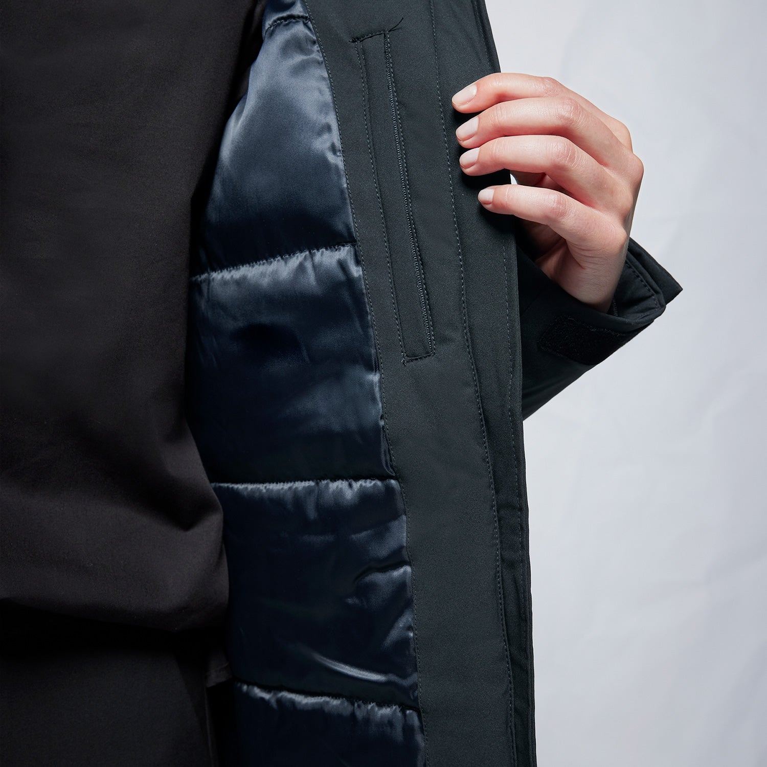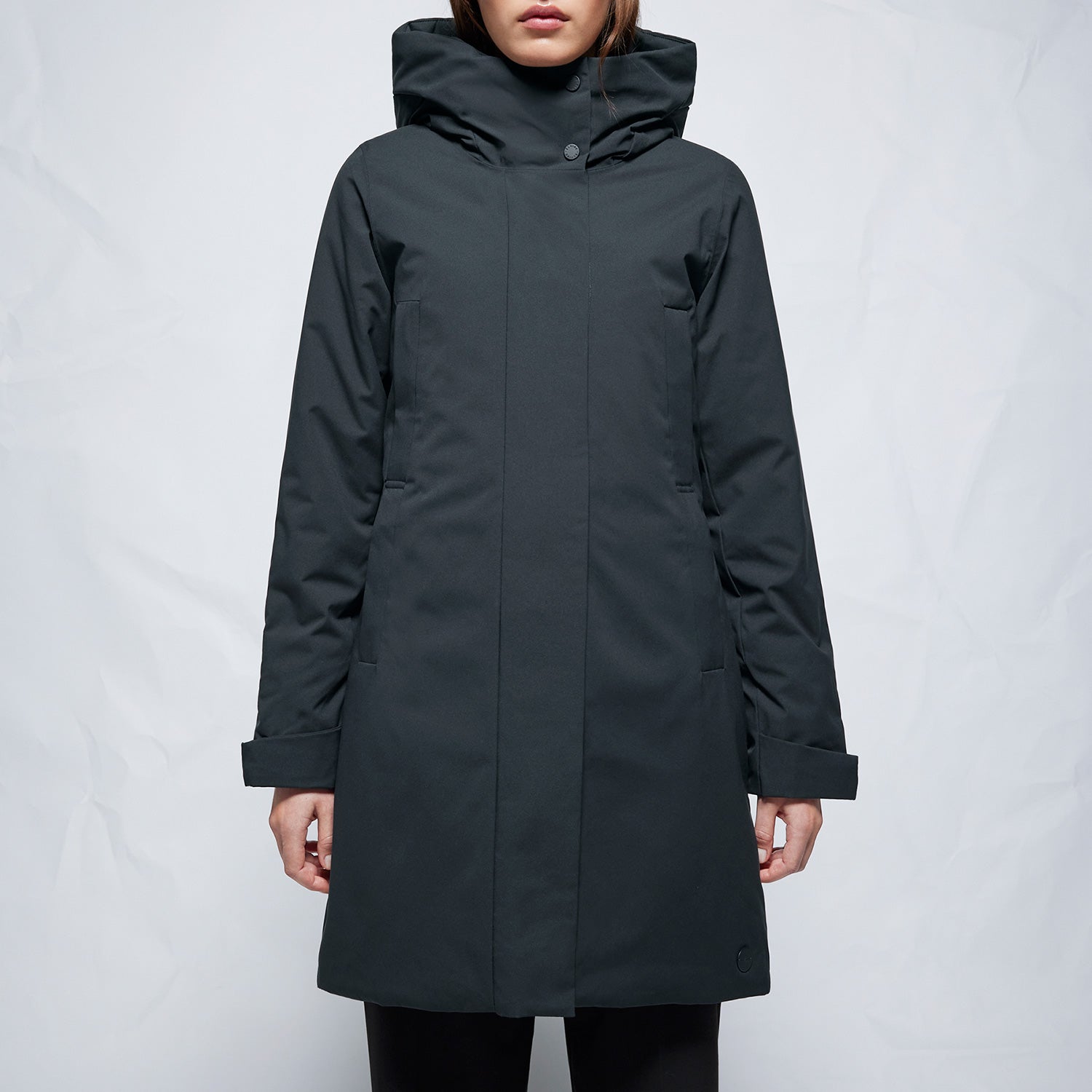 Eline er en vinterjakke med hætte med en figursyet silhuet lavet i et Pet Poly 5K-stof. Materialet er hurtigtørrende og har en vandtæt membran, der beskytter mod pludseligt regn. 4-vejs stretch tilføjer komfort, mens en strålende farveægthed bevarer jakkens friske look fra den ene sæson til den anden. Detaljer inkluderer dobbelte paspolerede lommer og vitale tapede sømme.