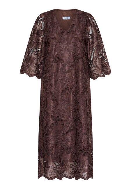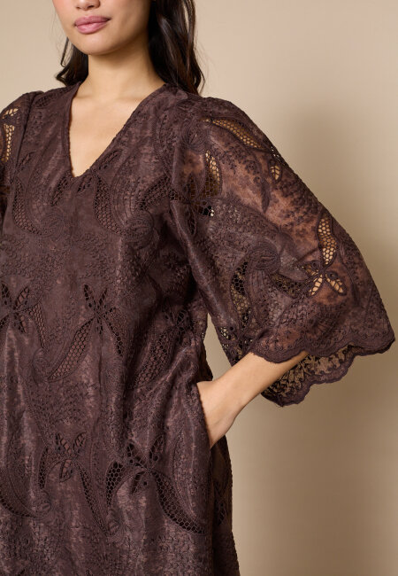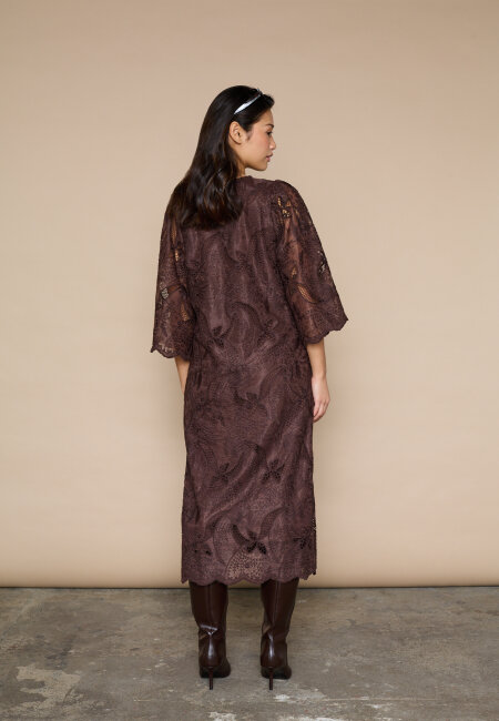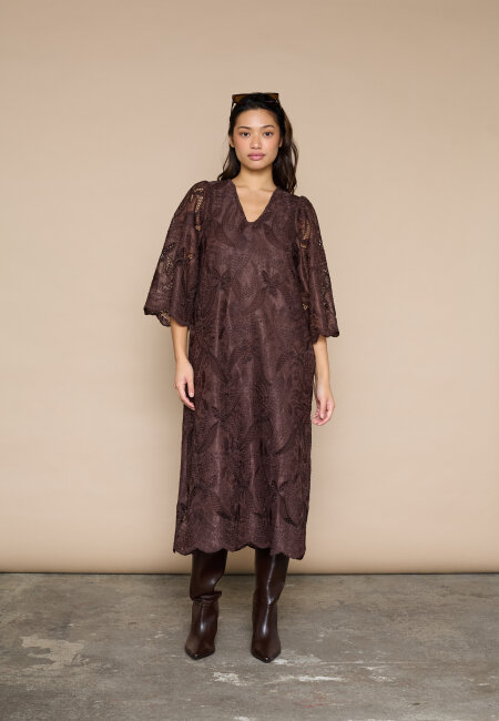 Feminin blondekjole fra Love&Divine i en midi længde. Kjolen har trekvartærmer og en påsyet underskjole. Modellen har en str. S på.
